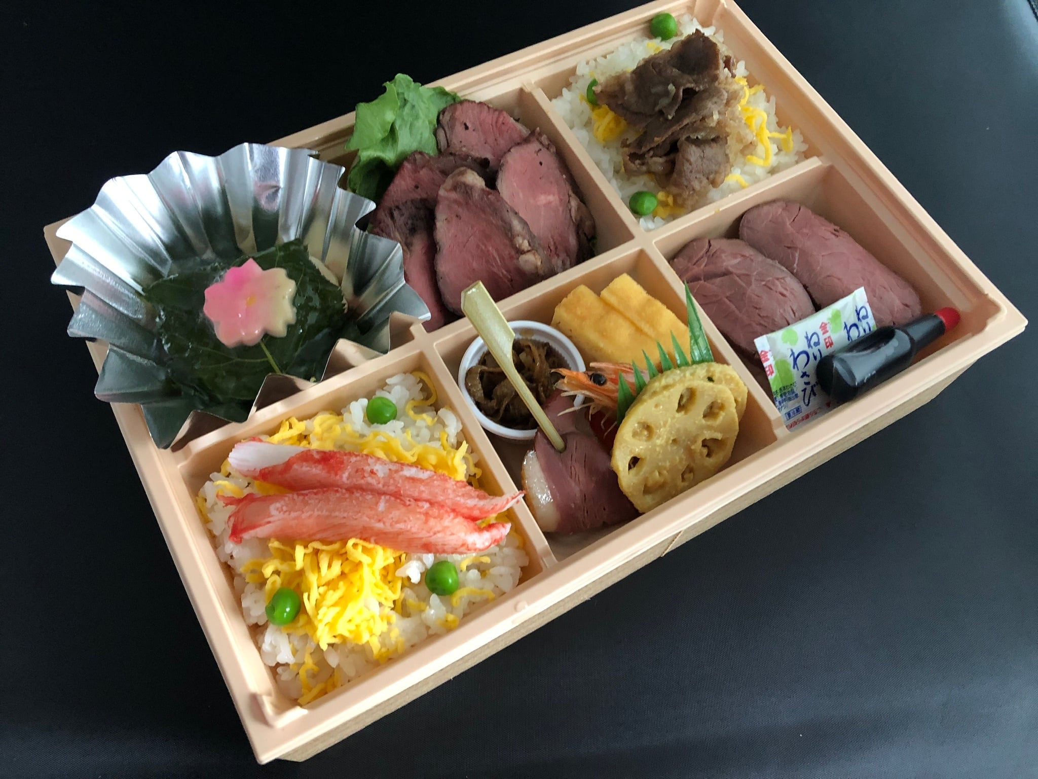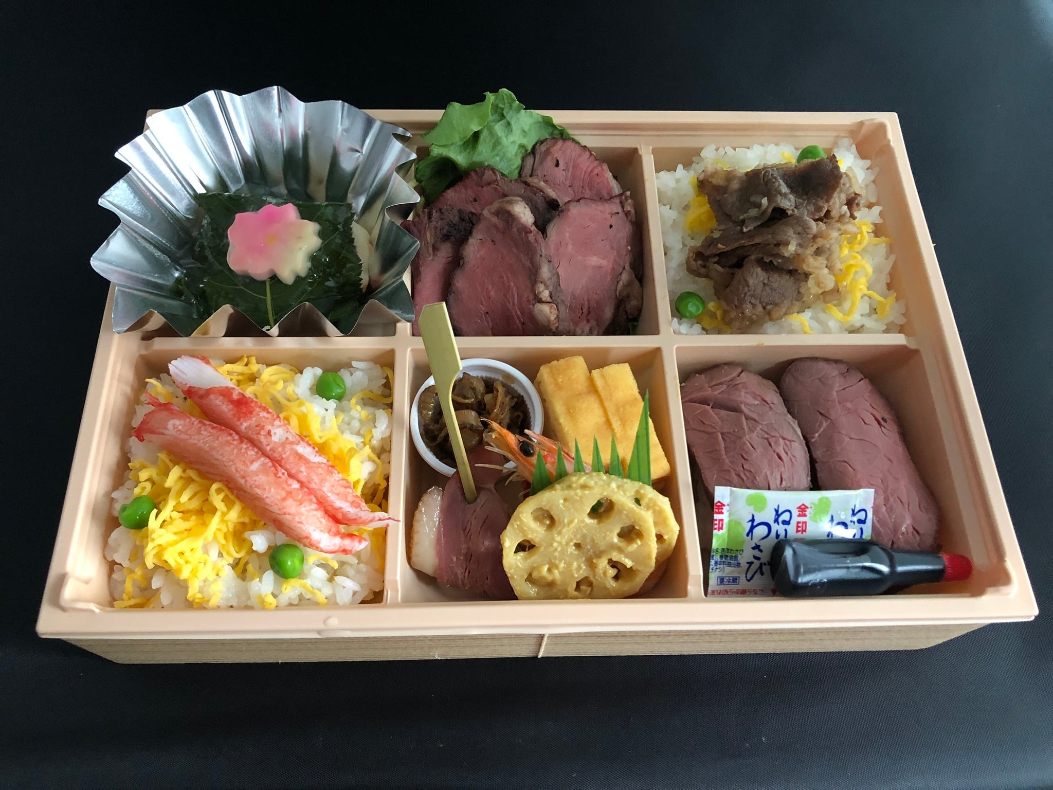 牛の握り寿司、すき焼きご飯、ステーキなど入ったお肉を様々な形で楽しめるお弁当です。天ぷらも入り欲張りな貴方ぬピッタリのお弁当です。